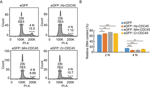 进一步研究表明,过表达cdc45抑制细胞的DNA复制合成过程。流式分析结果显示,转染有eGFP::Hs-CDC45、eGFP::Mm-CDC45、eGFP::Cr-CDC45的HeLa细胞中,2 N染色体细胞群数目明显多于对照组,而4 N染色体细胞群数目明显少于对照组(图2 A, B)。