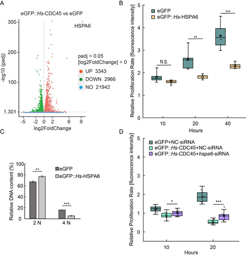 随后,研究团队通过转录组测序分析,发现hspa6在过表达有cdc45的HeLa细胞中上调表达最为显著(图3 A)。高表达水平的HSPA6亦对HeLa细胞增殖与DNA复制过程具有抑制效应(图3 B, C)。进一步的营救实验表明,hspa6可能为参与高表达水平CDC45调控细胞周期运转的下游基因。同时转染hspa6-siRNA与Hs-cdc45可部分营救由于过表达cdc45导致的细胞增殖速率被抑制的表型(图3 D)。