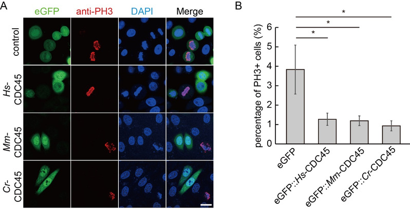 细胞周期运转的精准调控是维持有机体稳态发育的关键步骤。Cell Division Cycle 45 (CDC45)是参与真核细胞DNA复制起始过程的核心蛋白之一,且目前为止尚未发现可替代因子。根据之前的报道,cdc45在完成三次有丝分裂后的无DNA复制合成过程的海鞘胚胎脊索细胞中高表达。研究团队发现高表达水平的CDC45对于细胞周期运转具有负调控功能。过表达不同真核生物来源(Homo sapiens、Mus musculus、Ciona robusta)的CDC45均抑制细胞增殖过程(图1 A, B)。