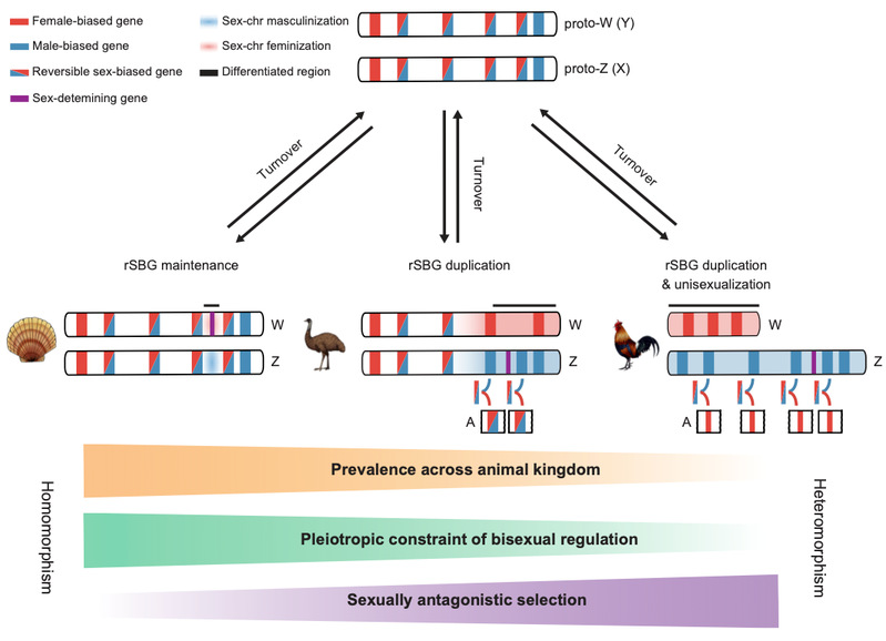 性别起源进化被誉为进化生物学谜题之皇后,是生命科学领域最具吸引力和最热门研究方向之一,而性染色体如何产生与进化更是其中的核心科学问题。一百多年来,围绕具异形性染色体的经典模式生物所展开的相关研究,形成了性染色体进化的传统理论模型,即认为性染色体起源于常染色体,性别决定基因的出现会引起性染色体间发生重组抑制,直至退化成异形性染色体(两条性染色体一长一短)。这一传统理论长期主导了学界对性染色体进化的基本观点。但与之相悖的是,自然界中同形性染色体(两条性染色体无明显分化)比异形性染色体更为普遍存在,却往往被学界解释为仍处于性染色体“进化早期”或只是“规则外的个例”。这不禁让人怀疑,异形性染色体真的是性染色体进化的最终命运吗?为解答这一关键问题,本团队将视角转向古老起源的海洋冠轮动物类群(动物三大类群之一),通过绘制并收集了横跨整个扇贝科的八个代表性物种染色体水平基因组,利用多组学手段首次鉴定到冠轮动物同形性染色体(ZW)、控制性别决定的主效基因和保守增强子。研究团队惊讶地发现扇贝性染色体呈高度未分化状态且已维持至少3.5亿年之久,是动物界中已知最古老的同形性染色体,甚至比鸟类、哺乳动物等经典异形性染色体分化形成时间的两倍还要久。这一惊人发现有力反驳了同形性染色体仍处“进化早期”的传统论断。通过深入分析发现,与异形性染色体相比,同形性染色体上显著富集大量双向性别偏好基因(即存在雌雄表达偏好的可逆性反转),这些基因多能性的进化限制可能是维持性染色体不分化的普适性机制。此外,发现由性别决定增强子易位所驱动的性染色体转换也是维持同形性染色体的重要因素。通过跨动物类群比较分析,发现当性染色体从同形向异形转变时,需要性二态和性选择压力的驱动,并通过基因加倍将双向性别偏好基因亚功能拆分,以解除其基因多能性的进化限制。这一发现揭示了同形性染色体的稳态维持才是性染色体进化的“常规”,驳斥了传统理论模型的“同形→异形”进化宿命论,从而更好地解释了为何自然界中同形性染色体比异形性染色体更为普遍存在的现象。本研究提出了性染色体维持和分化的新进化模型,修正了传统理论模型的缺陷,为理解性别起源进化和遗传调控开辟了崭新的研究视角。