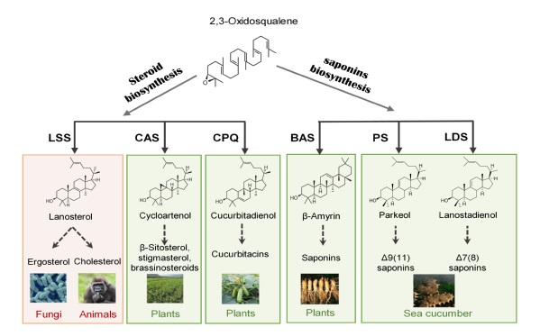 图2. 海参皂苷合成途径与经典动植物固醇合成途径比较