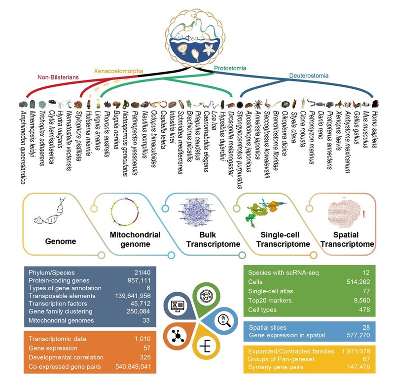 进化发育生物学(EvoDevo)是近年来国际上迅速崛起的新兴前沿交叉学科,旨在通过研究生物界高度多样化的发育过程,从而深刻归纳阐释发育过程背后隐藏的进化驱动机制和规律,以解答被Science杂志评为125个最具挑战性的科学难题之一的生物多样性决定机制问题。在过去的几十年里,利用经典模式生物(如黑腹果蝇、秀丽隐杆线虫、斑马鱼和小鼠)所开展的广泛研究给我们带来了生物学领域诸多重大发现和突破,奠定了目前遗传、发育和进化等领域的基本知识构架体系。然而,为数甚少的模式动物无法涵盖动物界高度多样化发育过程的全部信息,更无法提供对整个动物界发育进化过程的全景式解读和归纳。为填补这一极大的知识空白,利用具有关键系统发育位置和全谱系覆盖的新兴模式生物来描述整个生命树的发育进化,对驱动进化发育学领域的跨越式发展具有极为重要科学价值和意义。高通量测序技术的革命性突破及各类组学技术广泛应用,为生命科学领域带来前所未有的发展契机。基因组学、转录组学以及单细胞技术加速了许多传统的非模式生物转变成新兴的模式生物(如栉水母、丝盘虫、玻璃海鞘、侏儒蛤等)。尽管近些年非经典模式动物类群已积累了海量的多组学资源,并仍以史无前例的规模快速增长,但对这些储存分散的组学资源进行整合和综合分析仍是目前国际上动物进化和发育研究领域共同面临的重大挑战,迫切需要系统建立面向整个动物界的进化发育综合组学数据库和相应的分析工具和平台。