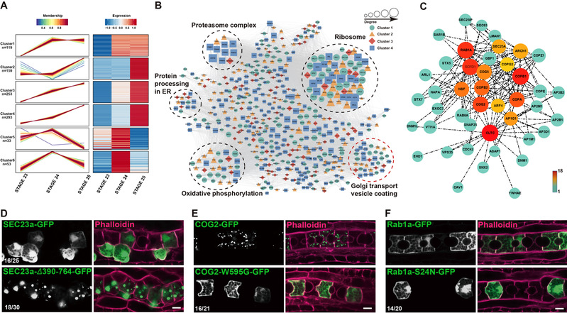 (C) 通过PPI网络邻域分析细胞内囊泡运输蛋白的调控枢纽蛋白。(D-F) 细胞囊泡运输节点蛋白突变体表型。Bars = 10 μm。