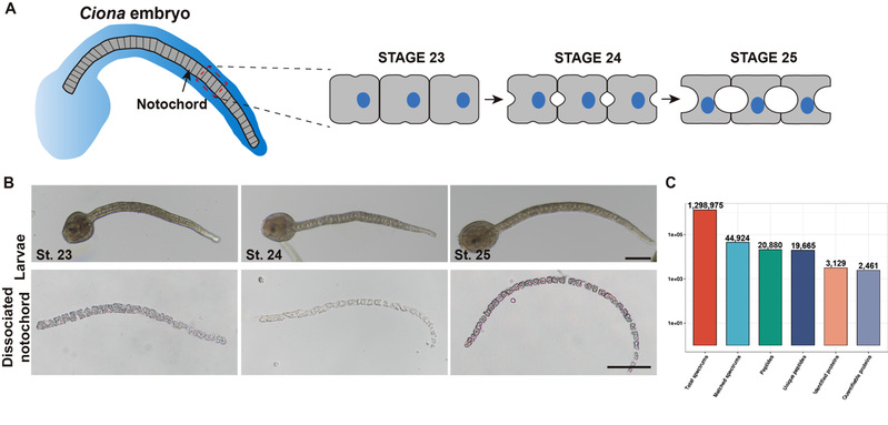 (A) 海鞘脊索管腔形成过程示意图。(B) 管腔形成过程的海鞘脊索组织分离。Bars: 100 μm。(C) 蛋白质组鉴定总览。