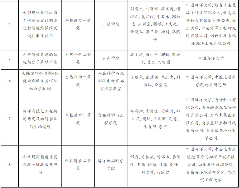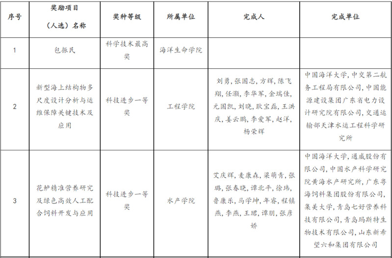 学校作为第一完成单位还获得山东省科学技术奖项目奖7项,其中一等奖3项、二等奖4项,获奖项目质量、数量、一等奖数量均创历史最好成绩。学校获奖项目分别为:工程学院刘勇教授主持完成的成果“新型海上结构物多尺度设计分析与运维保障关键技术及应用”、水产学院艾庆辉教授主持完成的成果“花鲈精准营养研究及绿色高效人工配合饲料开发与应用”和工程学院刘贵杰教授主持完成的成果“大型现代化深远海养殖装备设计制造及智慧运维保障关键技术及应用”荣获省科技进步一等奖,水产学院战文斌教授主持完成的成果“牙鲆高效免疫的细胞与分子基础研究”、海底科学与探测技术教育部重点实验室于胜尧教授主持完成的成果“大陆俯冲带深熔-花岗岩成因及其深部动力学机制”荣获省自然科学二等奖,食品科学与工程学院牟海津教授主持完成的成果“海洋高值化工程酶的开发及功能食品的生物制造”、海洋地球科学学院邢磊教授主持完成的成果“非常规高精度地震探测关键技术及应用”荣获省科技进步二等奖。以上高等级科技奖励的获得,充分体现了学校近年来有组织科研统筹谋划、精心培育高水平成果的显著成效。学校刘勇、刘贵杰、张彦娇教授作为获奖项目代表应邀参会。