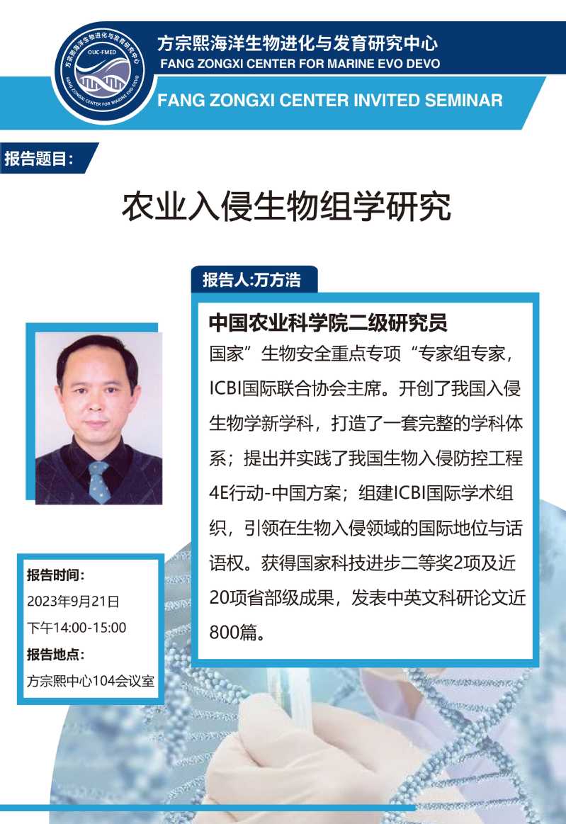 方宗熙海洋生物进化与发育研究中心将邀请中国农业科学院万方浩研究员进行报告。报告详情: