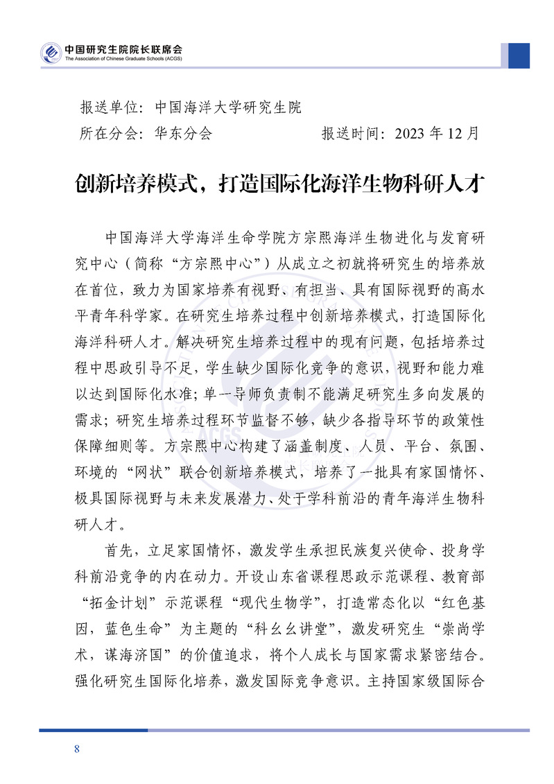 近日,中国研究生院院长联席会研究生教育“最佳实践”案例(第2期)发布,开云电竞网址方宗熙海洋生物进化与发育研究中心(简称“方宗熙中心”)报送的《创新培养模式,打造国际化海洋生物科研人才》成功入选。