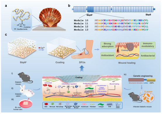a,b) 基于扇贝足丝关键粘附蛋白Sbp9的发现;c) 涂层组装机制及创面促愈合活性探究。