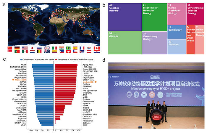 图1 MolluscDB数据库国际影响力(a: 访问国家;b: 引文领域;c: 数据库排名;d: 国际M10K计划启动)