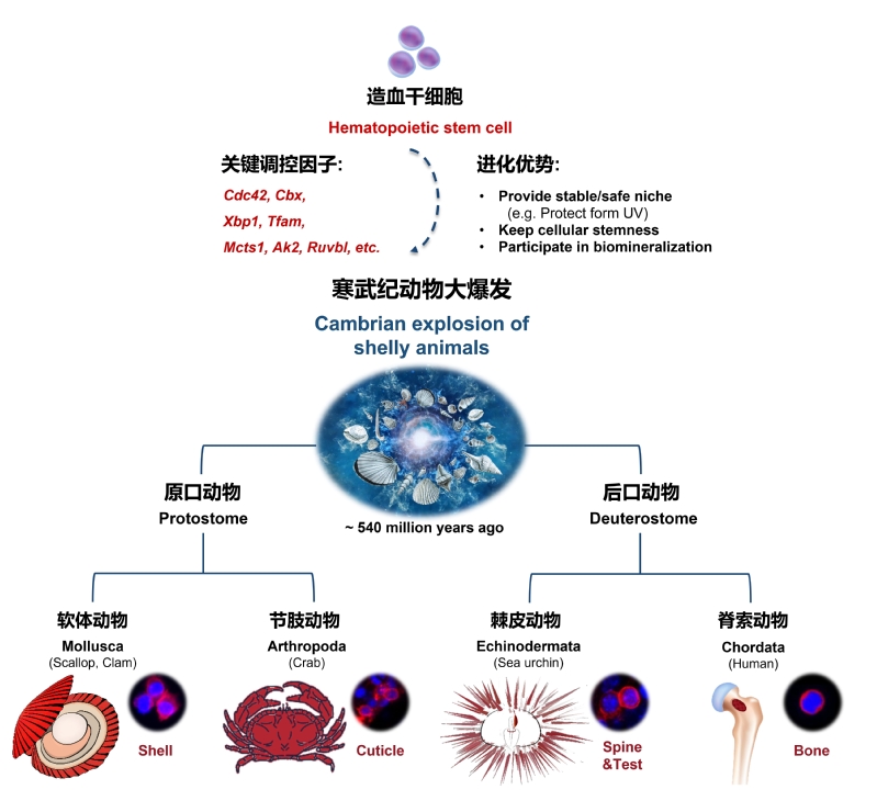 寒武纪生命大爆发(距今约5.4亿年前)作为地球生命演化史上最重大的创新事件之一,以矿化骨骼动物的爆发式涌现为标志性特征,奠定了现今地球生物多样性的基本蓝图。但这一现象的成因至今仍是演化生物学的核心谜题之一,也被称为生命演化史上的重大“悬案”。长期以来,无脊椎动物的外骨骼被视为无生命的矿化物(“无生命的石头”)。与之相对,脊椎动物骨骼则被认为是活的“器官”,其内骨髓具有终身造血功能,被视为脊椎动物在生命演化史中“特有”的关键创新,常被教科书列为经典认知和生物演化的典型案例。