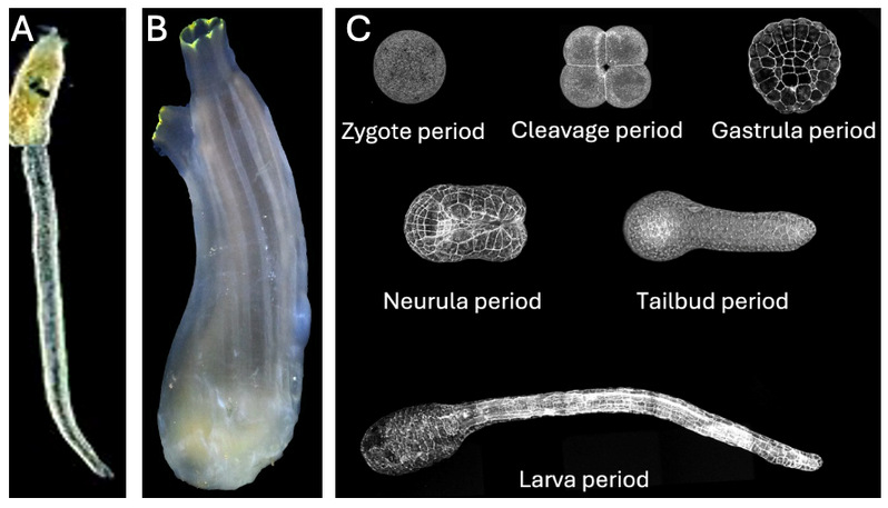 图1: 海鞘幼体(A),成体(B)以及胚胎发育过程(C)
