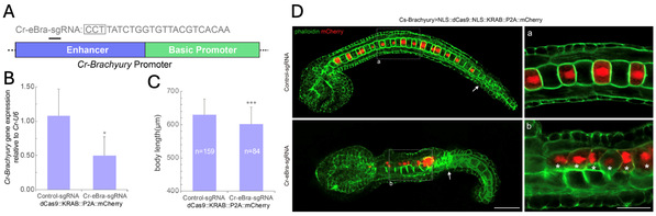 图5: 在玻璃海鞘(Ciona robusta)脊索细胞中实现基于 CRISPR/dCas9 的Brachyury 基因敲低和脊索形态表型发生
