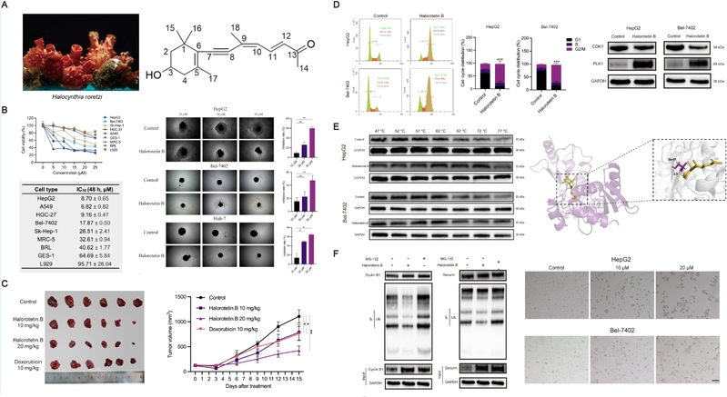 (A) 真海鞘来源的天然抗肿瘤化合物Halorotetin B。(B) Halorotetin B体外抑制肿瘤细胞及肿瘤细胞球增殖。(C) Halorotetin B体内抑制肿瘤生长。(D) Halorotetin B诱导肿瘤细胞周期阻滞。(E) 细胞周期调控蛋白UBE2C为Halorotetin B的直接作用靶点。(F) Halorotetin B通过靶向UBE2C诱导肿瘤细胞周期阻滞及肿瘤细胞衰老。