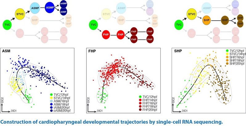 王玮教授应用单细胞测序技术,以海鞘作为模式动物,分别构建了心肌(first and second heart lineages)和咽肌(pharyngeal muscle)前体的分化轨迹(developmental trajectories),并从转录组尺度揭示了这一早期分化过程中的调控机制。