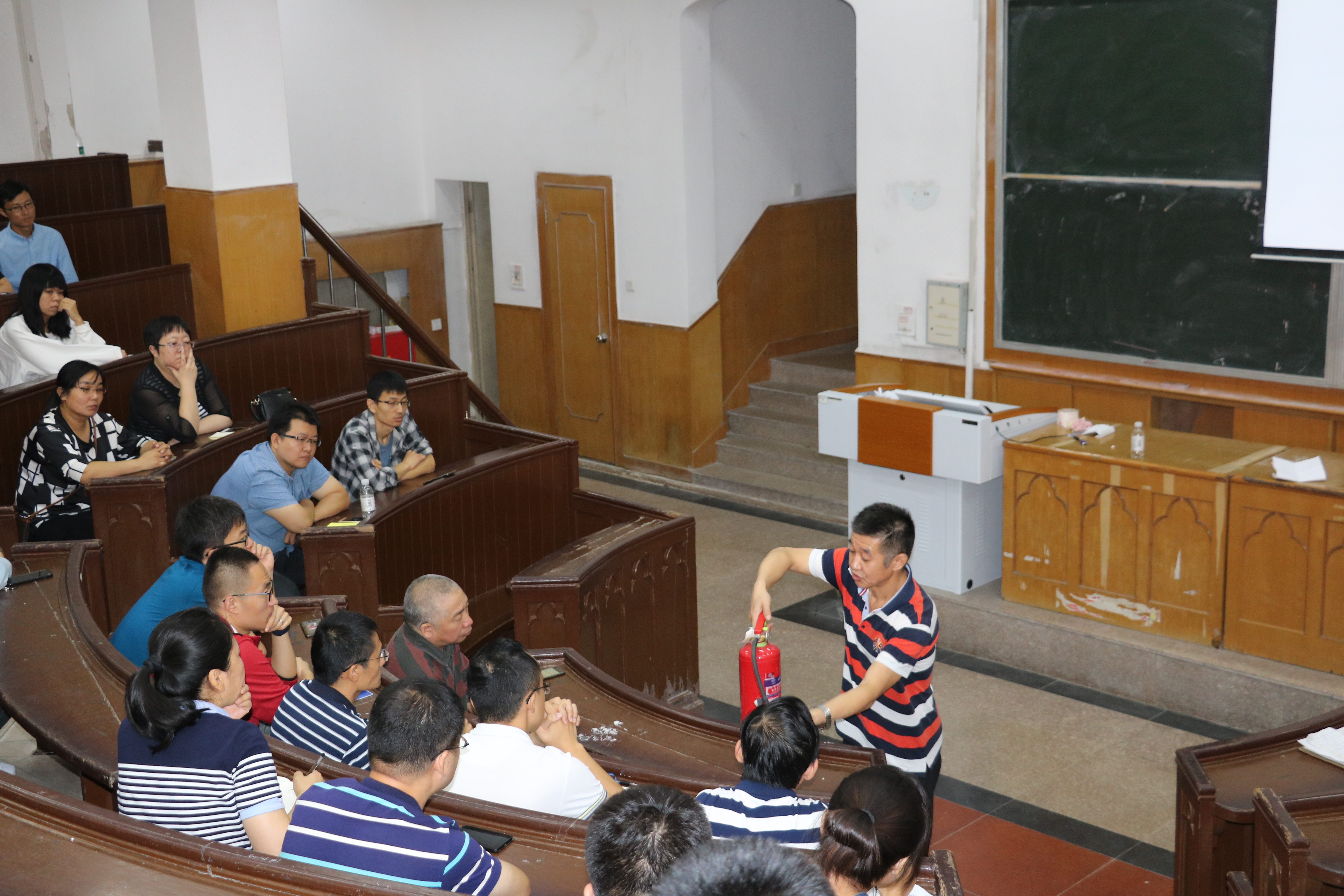 (校保卫处消防科科长崔宏为师生讲解示范灭火器的使用方法)