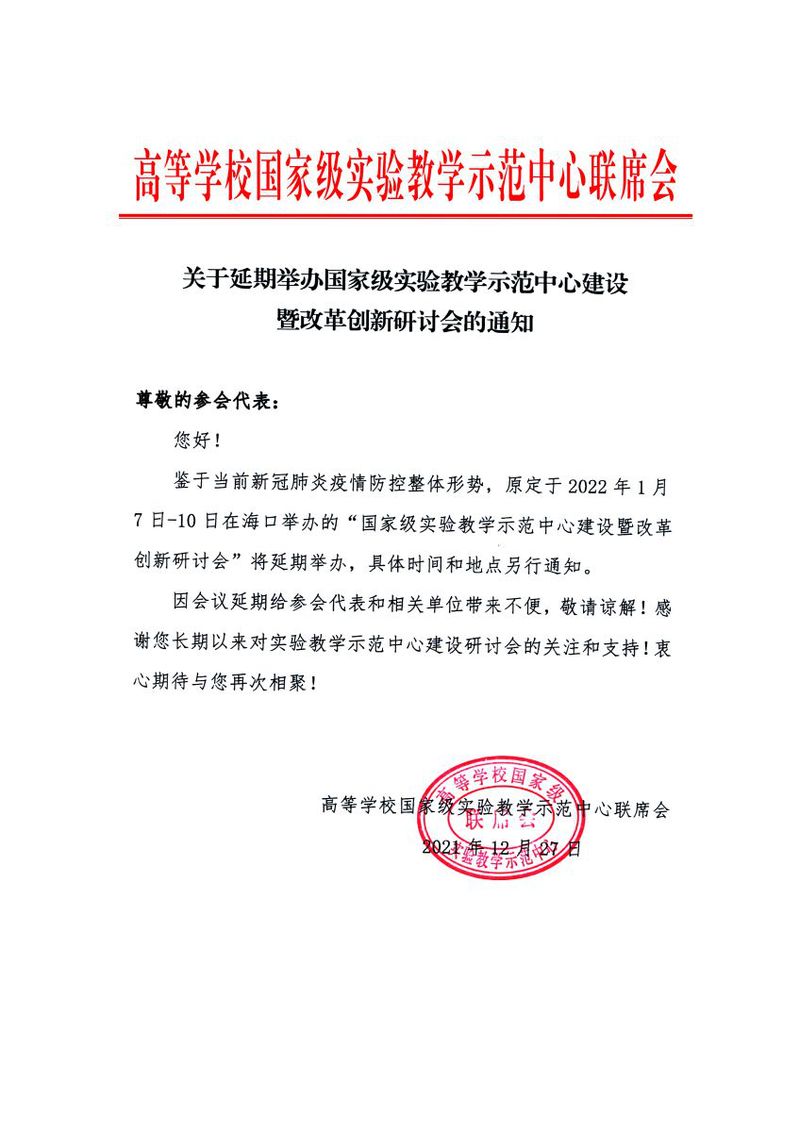 关于延期举办国家级实验教学示范中心建设暨改革创新研讨会的通知