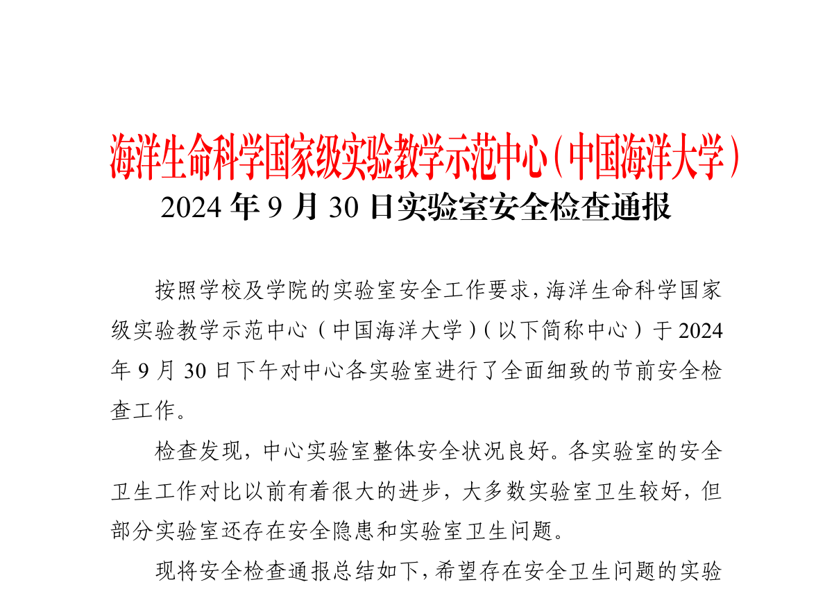 本站讯 为进一步加强国庆假期期间实验室安全管理工作,保障教学、科研等各项工作安全有序开展,确保实验室的平稳运行与人员安全,根据学校《关于2024年中秋节、国庆节放假及有关事宜的通知》精神,以及国有资产与实验室管理处《关于做好中秋节和国庆节期间实验室安全工作的通知》要求,9月30日下午,海洋生命科学国家级实验教学示范中心(开云电竞网址)(以下简称中心)常务副主任刘晓收、副主任毛玉峰、支部书记王祥红、中心安全员乔翰超一行4人,深入各教学实验室,围绕实验室的重点部位、重点设备、重要设施,办公场所和楼道公共区域的消防安全等开展了全面细致的节前安全检查工作。
