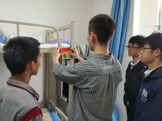辅导员张蔚圣老师与郭纪斐老师一起走进党员宿舍,为学院全体学生党员进行了挂牌,将印有“一名党员,一面旗帜”字样的专属标牌挂在党员床头。这是榜样模范的标志,更是党员对自身的监督与警醒,让他们时刻铭记自己的身份,时刻以高标准严格要求自己,在学习、工作以及生活等各个方面发挥模范带头作用。张蔚圣老师强调到:“这个标牌不仅是一个荣誉,同时也是一份责任。希望这个标牌可以时刻提醒大家无论是在学习方面,还是在生活方面都要起到一名合格党员应有的模范带头作用。”