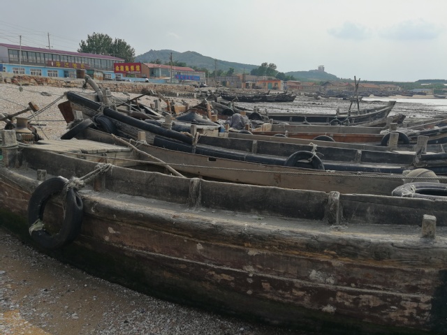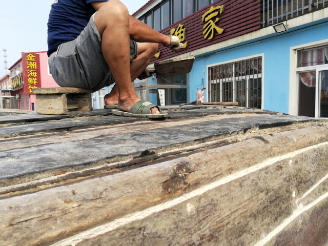 岸边停靠的均是木船,很少能看到铁制渔船,渔船的颜色多呈朱红色,是由于刷了防污漆的缘故,主要用于减少海藻类、海蛎子的附着,但是也能看到在船只与海滩摩擦较多的部位,防污漆脱落,已经附着了一层藻类微生物。但是经过团队成员对几位渔民的访谈,了解到,渔民更关注船身接缝处的防污,因为在接缝处会发生缝隙腐蚀现象。缝隙腐蚀是一种在宏观腐蚀电池作用下的电化学腐蚀现象,在覆盖层下、沉积物中和附着的生物均会造成缝隙腐蚀。渔民的防治方法是用石灰和桐油混合成浆体,涂覆在缝隙处,具有防水、密封的作用,在古代就有渔民用这种混合物对木船木条缝隙进行防漏。对于其它部位的防护渔民们主要是先对船体涂刷一层桐油,也是起密封作用的,然后再涂刷一层防护漆。对渔船进行防护之后,渔民们会把船置于沙堆之上,以减少与土壤中微生物的接触,减少微生物腐蚀。