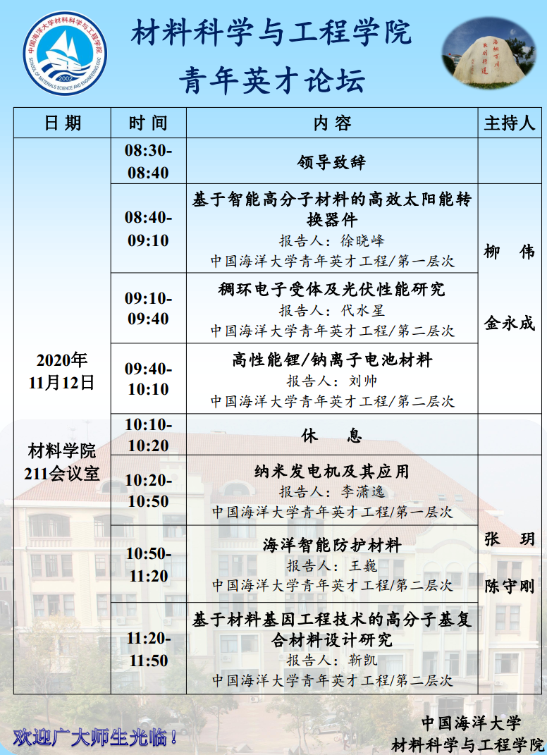 本站讯 2020年11月12日,材料科学与工程学院“青年英才论坛”在材料楼211会议室举行,学院近两年新引进的入选校“青年英才工程”的6位老师围绕各自的科研工作经历、研究方向以及未来科研布局进行了学术报告,学院近30名师生参加了本次论坛,论坛由学院王昕院长致开幕词。
