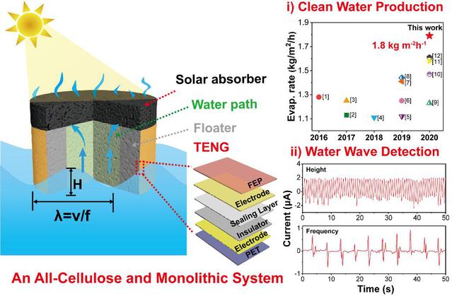 徐晓峰教授团队通过对纳米纤维素材料的改性和微观结构调控制备了一体式全纤维素基太阳能驱动光/热能量转换器件,实现了高效、稳定、耐用和环境友好的污水净化和海水淡化。基于光/热器件出色的自漂浮能力,成功地将其与纳米摩擦发电机结合,实现了在开放水域中对常见波浪信号的有效监测。学院青年英才李潇逸教授参与了纳米摩擦发电机的制备与波浪信号表征。