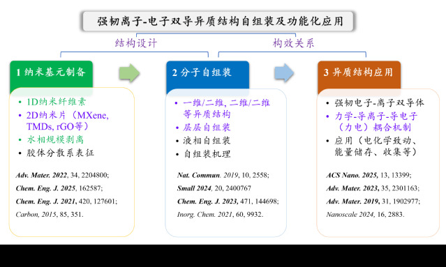 (2)建立了液相分子自组装强韧离子电子双导纳米异质结构(1D/2D, 2D/2D, 1D/0D等)的普适性策略;