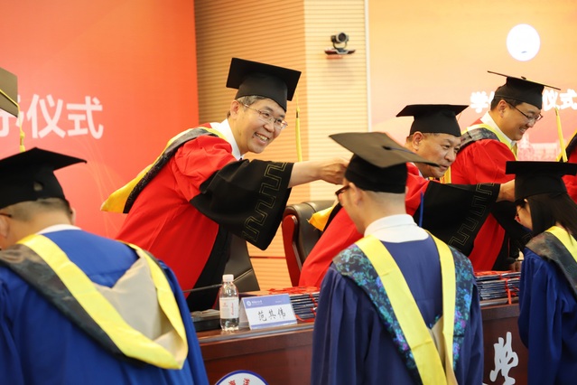 授位环节,校党委常委、副校长范其伟和学院学位评定委员会委员共同为毕业生一一拨正流苏,并颁发毕业证书和学位证书。