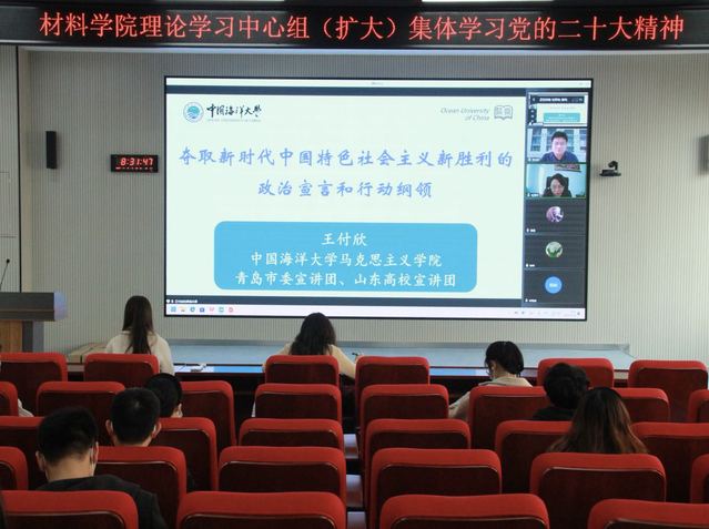 本站讯 11月9日上午,材料科学与工程学院党委组织召开理论学习中心组(扩大)会议,认真学习宣传贯彻党的二十大精神。会议邀请学校党的二十大精神宣讲团成员,马克思主义学院党委副书记、副院长王付欣作题为“夺取新时代中国特色社会主义新胜利的政治宣言和行动纲领”的专题讲座。学院党委书记杜军华主持会议。