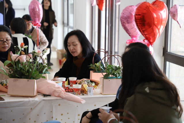 插花沙龙和冷餐会在学院一楼休闲空间进行。为方便学院师生,学院于2023年初在一楼休闲空间配置了吧台、冰箱、烤箱、微波炉、咖啡机等设施,为学院营造了温馨的氛围。当天一早,工会委员们用气球、彩带、桌飘等装饰品精心布置了活动场地,为每位女教职员工准备了鲜花、花泥、花盒等插花用具,以及点心、水果、饮品等丰富餐点。健步行归来的老师们在欢声笑语中享用了美食,分享了彼此工作、生活中的趣事,现场气氛非常热烈。餐会结束后,老师们认真学习了插花教学视频,纷纷动手进行创作,一支支鲜花在大家的巧手下成为艺术创作的画笔,老师们在互相探讨和比拼中完成了一束束美丽又颇具趣味的插花作品。