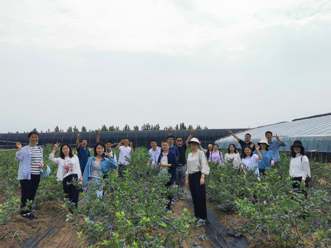 老师们乘车前往乡村振兴齐鲁样板省级示范区张家楼街道,沿途观看了社会主义新农村建设最新情况。到达农业采摘基地后,参观了各种蔬菜、水果种植大棚,并重点在蓝莓园开展了采摘活动。西海岸新区的蓝莓是全国农产品地理标志,也成为当地农民增收的重要产业。大家边采摘边交流,彼此帮助彼此分享,共同享受着工作之余的惬意。