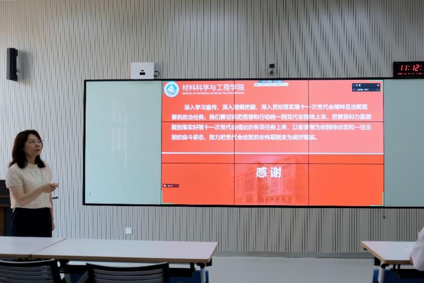 6月14日,材料科学与工程学院党委书记杜军华在材料楼108教室为2022级材料工程班级讲授题为“深入学习贯彻学校第十一次党代会精神,为加快建设特色显著的世界一流大学贡献青春力量”的形势政策课。