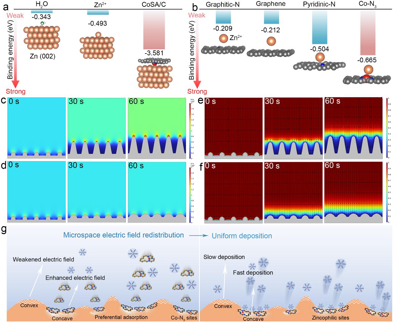 得益于无毒、不易燃和低成本的水系电解液以及储量丰富的锌金属负极,水系锌离子电池被看作是锂离子电池的绝佳替代品。然而,电极/电解液界面存在的固有不均匀性容易导致不均匀的电场分布和形核能垒,进而加剧枝晶生长和表面副反应,降低了电池系统的库伦效率和循环寿命,严重阻碍了水系锌离子电池的规模化使用。因此,通过调节微空间的电场分布来促进均匀的锌金属沉积对于构建高性能锌金属负极是具有重要意义的。