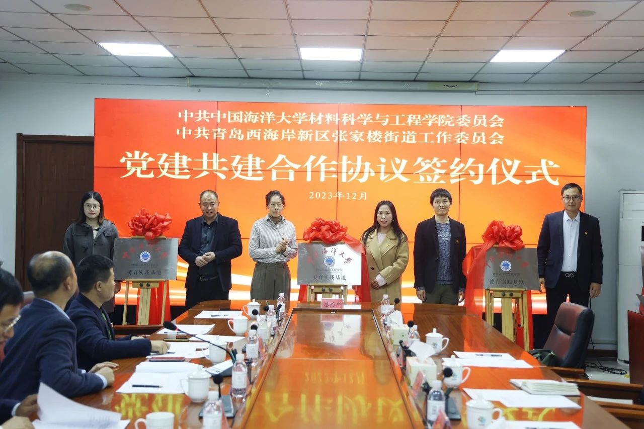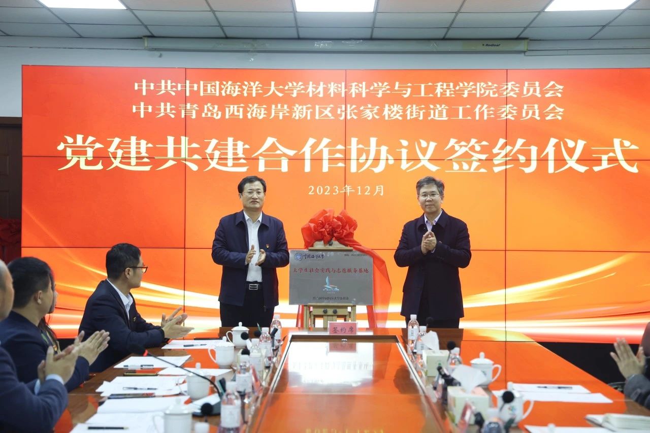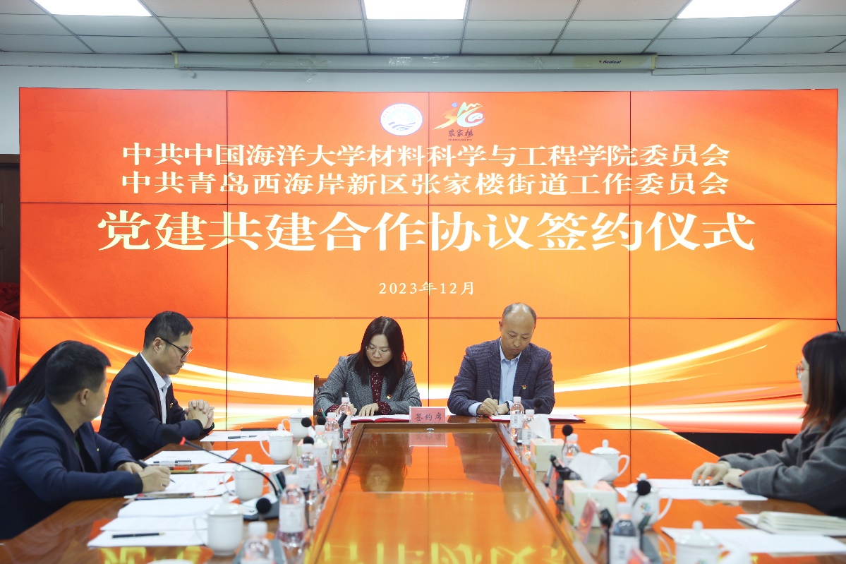 为充分发挥党建引领作用,实现党建资源共享,推动校城融合发展,12月1日,材料科学与工程学院与西海岸新区张家楼街道举行党建共建签约仪式。学校党委常委、副校长范其伟,材料科学与工程学院党委书记杜军华,西海岸新区工委区委常委、组织部部长刘陆莹,张家楼街道党工委书记车明超出席仪式。