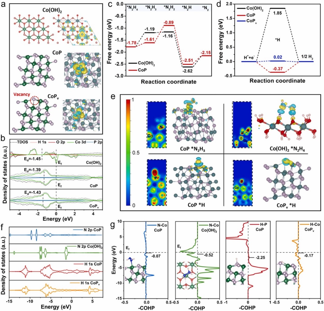 图2.肼氧化和析氢反应双位点的识别和DFT理论计算图。