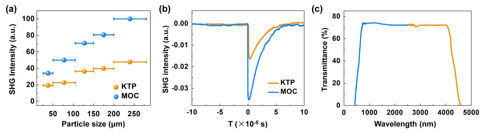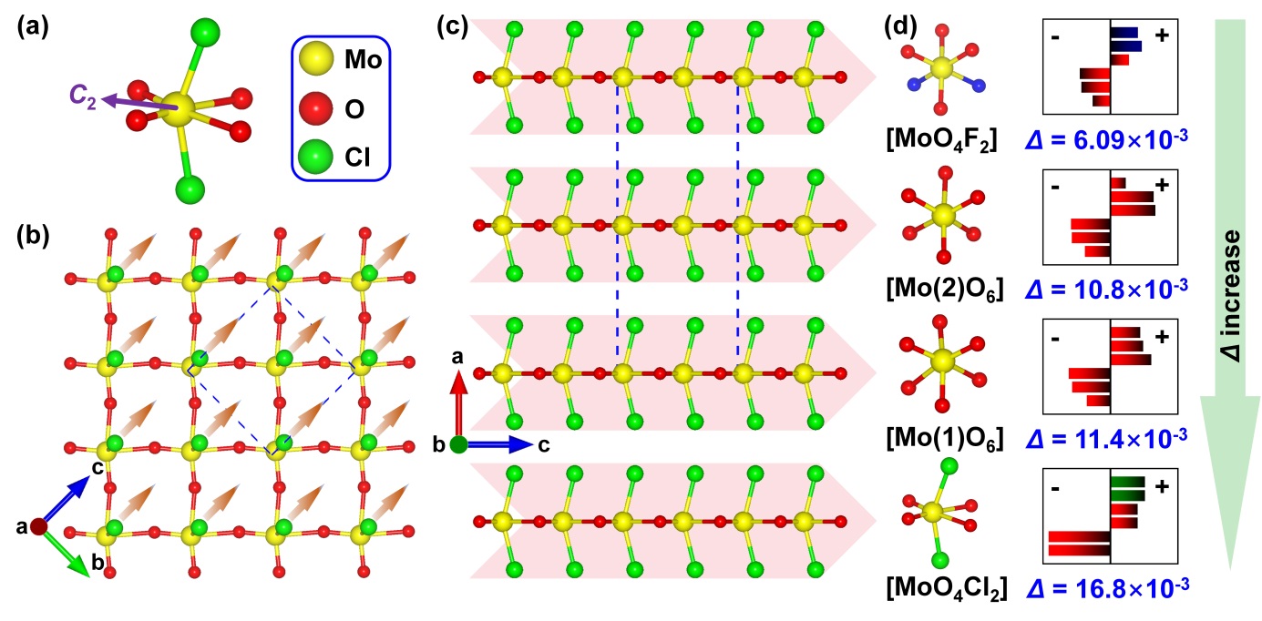 a在这一研究中,材料学院中-澳国际中心研究团队首次提出了一种通过单一高价d0过渡金属氧氯中心八面体功能模块以增加晶体结构的微观极化率和畸变度的策略,作为增强晶体材料非线性光学响应和双折射的有效途径。他们采用一种独特的无溶剂绿色合成法,通过将低熔点的无机固态过渡金属氯化物与助熔剂采用化学气相沉积(CVD)法合成创制了范德华MoO2Cl2晶体,这一单一功能模块组装策略涉及氯化二阶姜泰勒畸变的d0过渡金属功能模块[MoO4Cl2],其在晶格中一致排列形成二维[MoO2Cl2]∞层,进一步沿a轴堆积形成三维结构。相较于构型相似的[MoO4F2]和[MoO6]模块,[MoO4Cl2]模块具有更大的畸变度;同时[MoO4Cl2]模块比[MoO4F2]具有更大的极化率各向异性和超极化率。当这些单一功能模块均匀排列并紧密堆积则时可表现出增强的光学各向异性和极化率,这有利于同时最大化倍频响应和双折射。