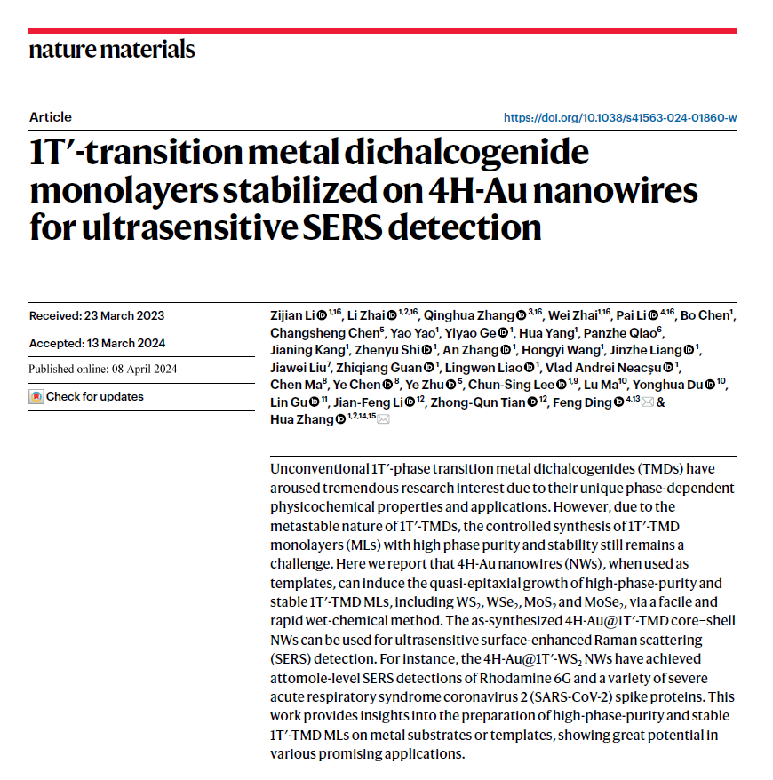 近日,开云电竞网址高分子材料与工程专业2019届本科毕业生李子健在《自然•材料》(Nature Materials)期刊以第一作者发表题为“1T′-transition metal dichalcogenide monolayers stabilized on 4H-Au nanowires for ultrasensitive SERS detection”的文章。