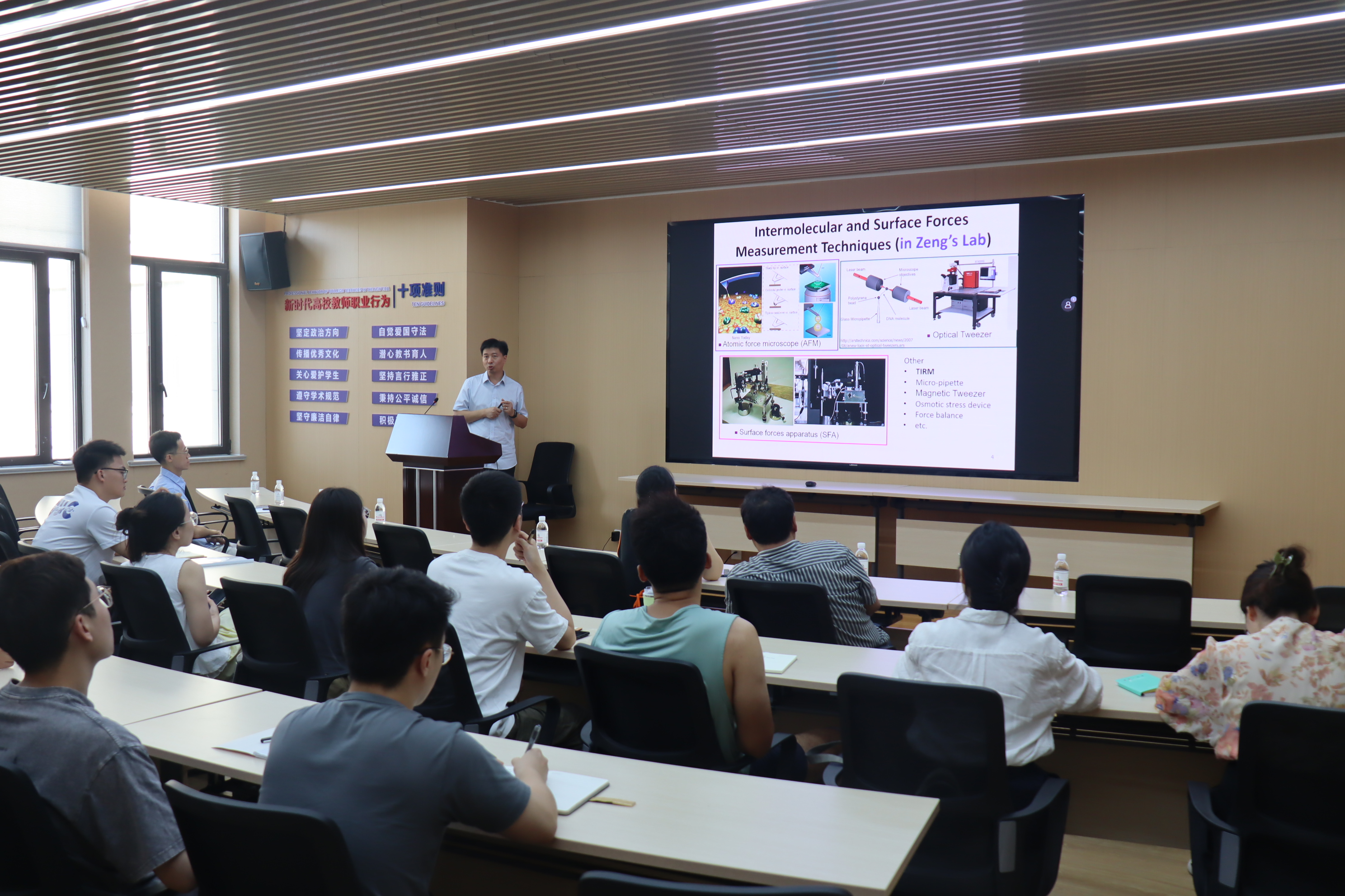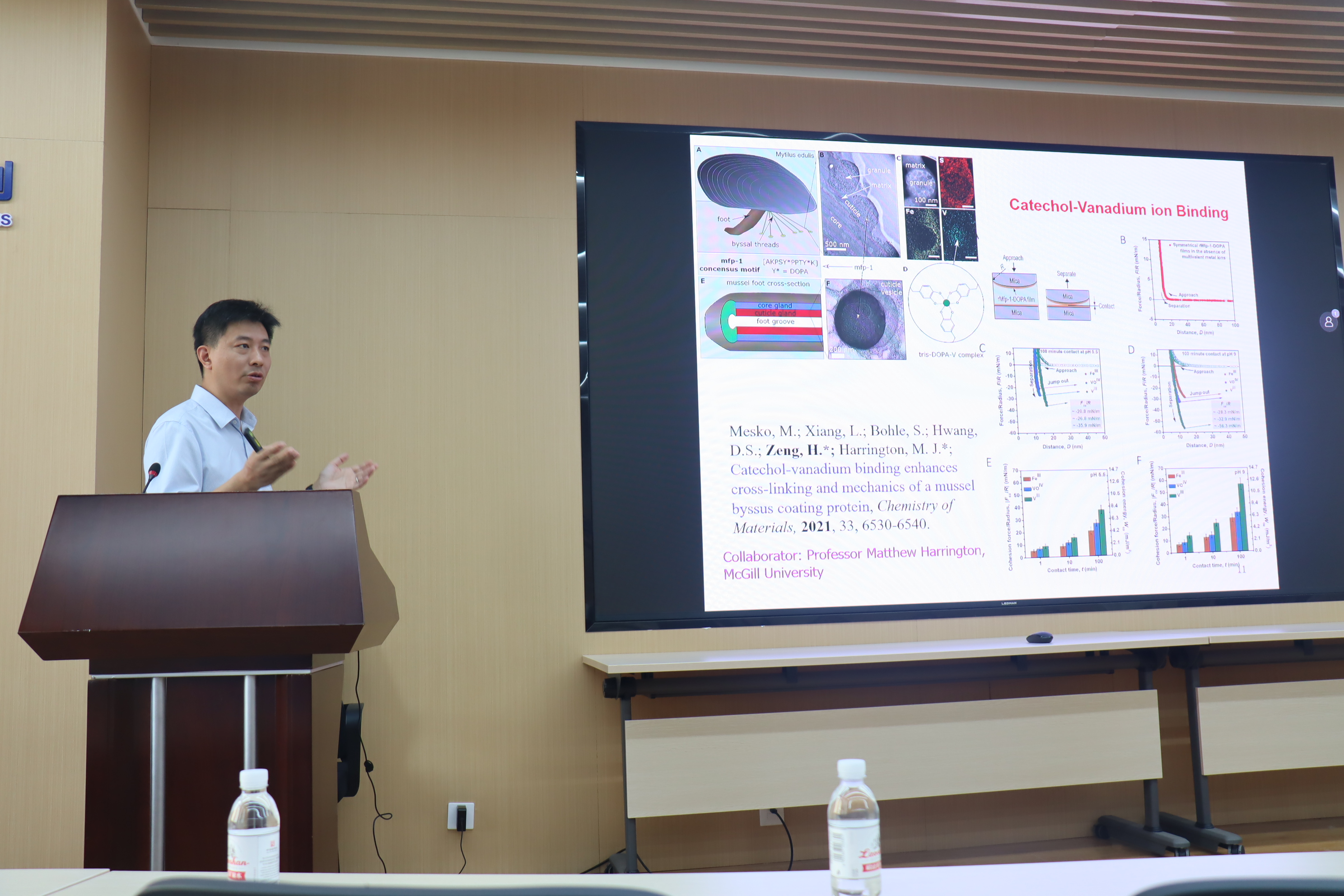 在本次讲座中,曾宏波院士介绍了分子间力和表面力的基本原理,以及一些常用的纳米机械技术。曾院士通过海洋贻贝的湿粘附案例系统地讲解了如何应用纳米力学工具来量化聚合物/生物聚合物材料和生物系统的分子间和表面相互作用的最新进展,为生物自组装过程提供了有用的见解,并介绍了通过可调节的非共价相互作用开发多功能软材料或表面的新方法,详细介绍了阳离子-π和阴离子-π作用的特点、强度、作用机理及应用范围。 在讨论环节中,多名师生踊跃提问,就高分子材料的交联方式、海洋工程材料的选材与设计等展开了深入交流,并就科研方向、人才培养、合作交流等方面进行了研讨。