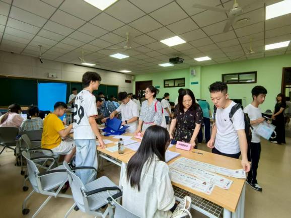 在教学区6413教室的注册报到现场,新生在学院工作人员和志愿者的引导下,有序完成身份认证、团关系转接、领取学生手册等环节,顺利开启校园生活。