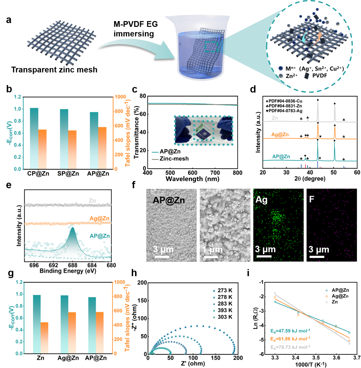 研究表明,Ag-PVDF涂层不仅显著提升了耐腐蚀性能,还降低了析氢电流密度,保持了高透光率(633 nm处71.4%),同时PVDF分子链可以调节银纳米颗粒的均匀生长,并通过C-F极性键与银表面的强偶极相互作用增强了涂层附着力。机械测试表明,AP@Zn在1000次弯曲循环后仍保持结构完整性和电化学性能稳定。此外,AP@Zn的低活化能(47.59 kJ mol-1)显著改善了电极反应动力学。