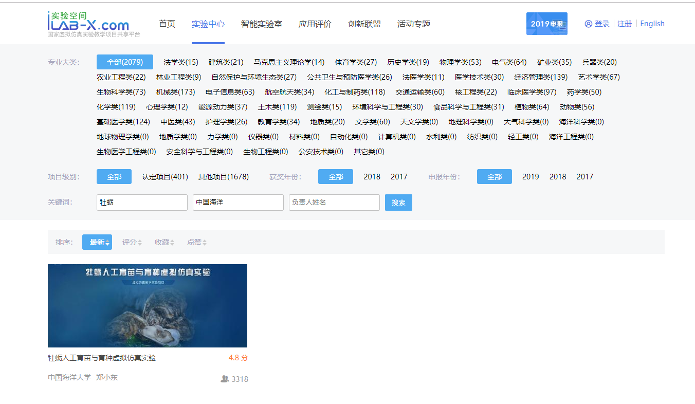 3、选择上方【实验中心】,在关键词搜索中项目名称输入【牡蛎】,学校名称输入【开云电竞网址】,点击搜索,如图5所示实验空间中搜索本项目的方式;