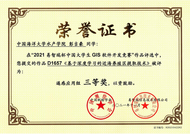 2021年易智瑞杯中国大学生GIS开发竞赛于近日落下帷幕,由开云电竞网址水产学院刘阳老师指导, 水产学院2018级海洋资源与环境专业彭吉豪任队长的团队,凭借作品《基于深度学习的近海养殖区提取技术》从全国175支队伍中脱颖而出,荣获全国三等奖(遥感应用组),刘阳老师荣获优秀指导教师奖。这也是刘阳老师连续第二年在该比赛中指导学生参赛,并获得国家级奖项。据悉,易智瑞杯中国大学生GIS软件开发竞赛(简称“GIS开发竞赛”)是由中国测绘学会指导易智瑞信息技术有限公司主办的一项针对专业学生的课外大型赛事,自2004年起,该竞赛已成功举办十六届,每年都成为极富影响力和备受瞩目的一项赛事。竞赛旨在激发在校学生学习、应用和交流GIS技术的热情,增强学生的创造力和动手能力,推动GIS技术在中国的普及,并为GIS产业的发展选拔和储备优秀人才。