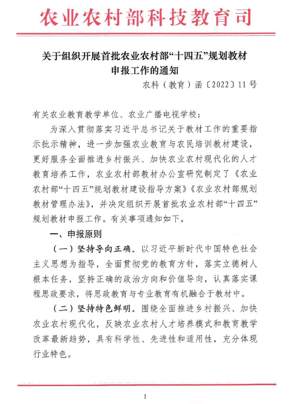 转发农业农村部《关于组织开展首批农业农村部“十四五”规划教材申报工作的通知》