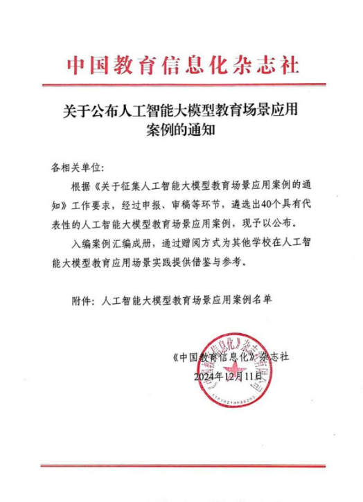 本次活动由教育部教育管理信息中心主管的《中国教育信息化》杂志社发起,旨在推动教育信息化的发展和应用,促进教育教学的创新和提升。经过征集、申报、评审等环节,在全国共遴选出40个具有代表性的人工智能大模型教育场景应用案例,入编案例将汇编成册,为其他学校在人工智能大模型教育应用场景实践提供借鉴与参考。