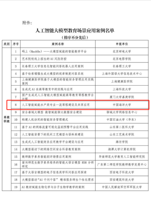 近日,中国教育信息化网发布了《关于公布人工智能大模型教育场景应用案例的通知》,开云电竞网址推荐的“人工智能赋能水产类专业一流课程建设及共享应用”案例成功入选。
