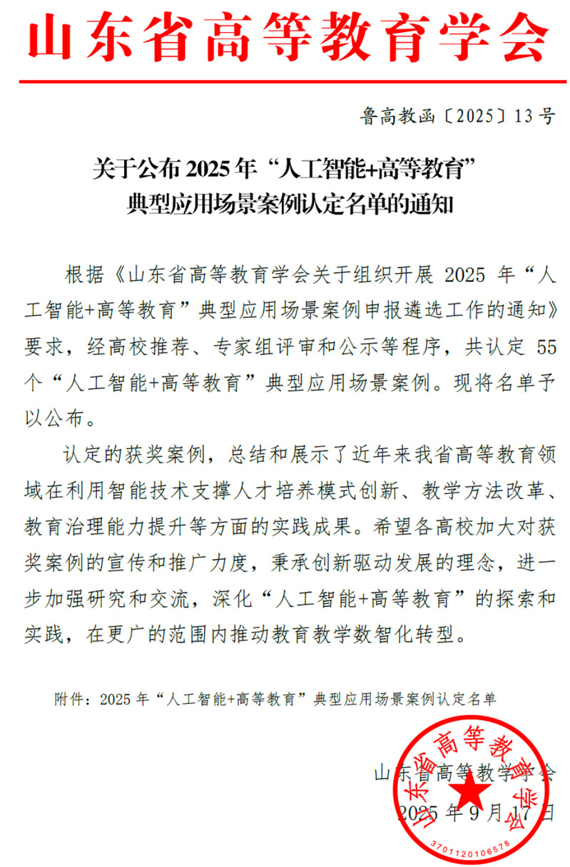 2025年4月25日山东省高等教育学会发布《关于组织开展2025年“人工智能+高等教育”典型应用场景案例申报遴选工作的通知》鲁高教函[2025]5号,经学院、学校推荐、评审等程序,本中心人工智能教学案例获批申报。案例总结和展示了学校在利用智能技术支撑人才培养模式创新、教学方法改革、教育治理能力提升等方面的实践成果。