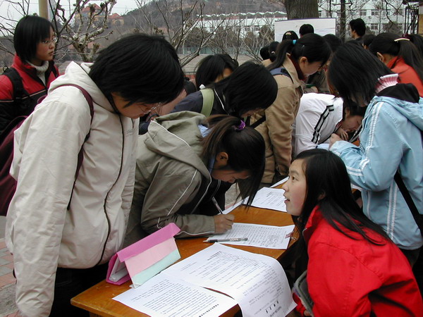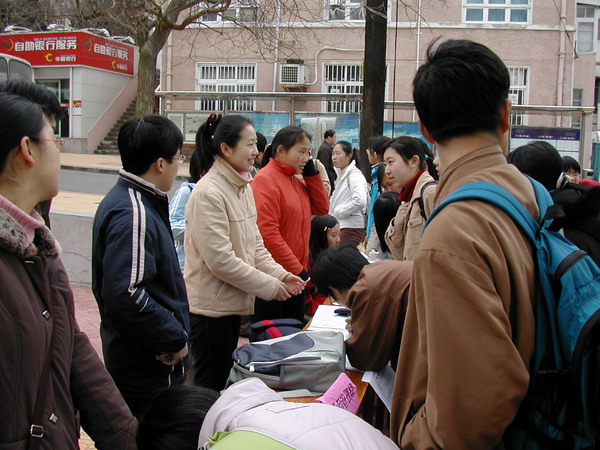 2004年3月2日,我校勤工助学指导中心在三角地进行了新学期的首次纳新活动。上前咨询的大多是03级的新生,勤工助学指导中心的成员正就同学们的问题进行详细的解说。