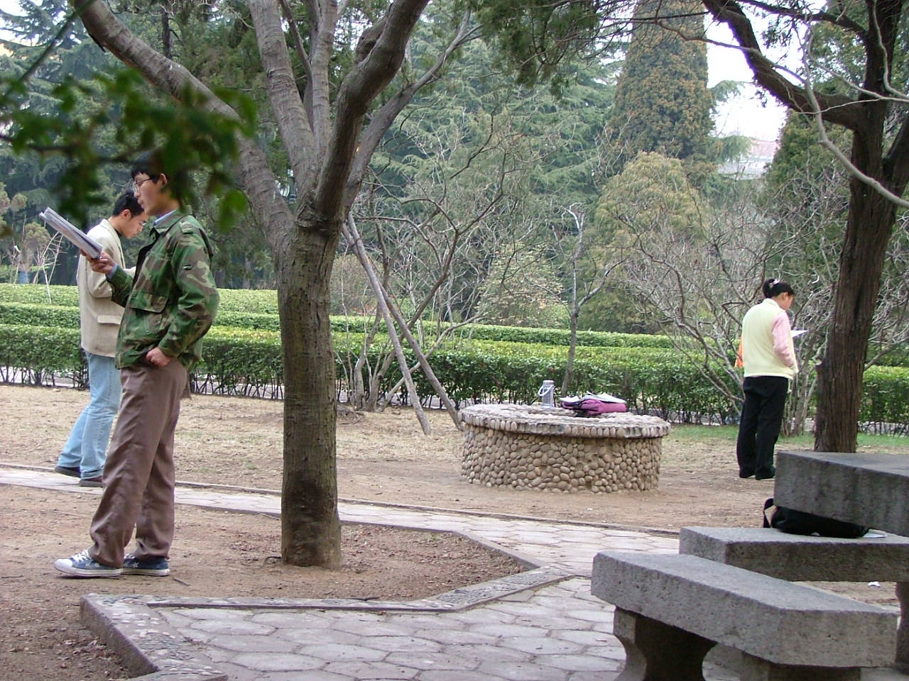你几乎可以在校园的任何一个角落发现他们的身影,旧教楼前,八关山上,图书馆前,他们有的是在原地高声朗读;有的却是一会埋头沉思,一会看一下手中的资料,然后点点头,好像是又有了什么新的体会一样;也有一些同学一边走动一边读书,他们真学习健身两不误。