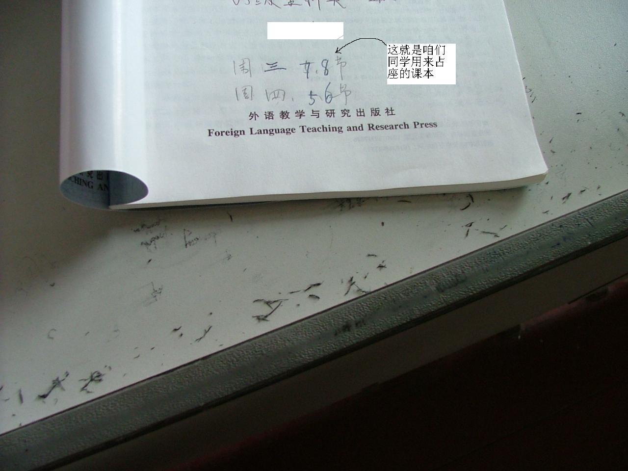 来到大学后,有很多的不习惯,但我们最大的不习惯却是——占座。以前,我们是坐在那里等老师来上课,现在我们不但要去找老师所在的教室,还要抢座位,自然就有些聪明人想出来了“占座”这一招,而我们这些后来人也就很自然地“继承并发扬”了前人的这些“光荣传统”,可以说在占座方面2003级的新生比以前的任何一级的学生都强许多,并且有很多的新招出台,明天的课今天晚上已经有人占上座了(图一), 有很多同学已经将本学期而不是某一节的高等数学课的座位占到了(图二),更有甚者竟然用一些纸条来占座,上书——占某某节某某课,就向农村里夏天占位子晒小麦一样,非常搞笑!就占座这件事情我们曾经问过很多同学,结果大多数同学都说这是被逼出来的,是“不得已而为之”之举,但这是真的吗?其实不然,我们也曾采访过一些同学,他们说其实你只要早点去,前面的座位还是很多的,并不需要用这种并不十分道德的行为。