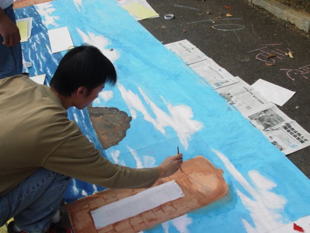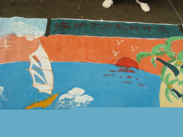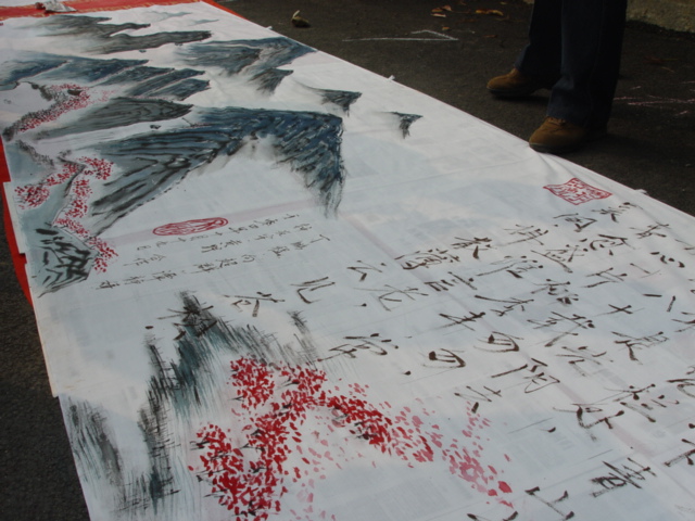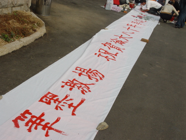 本站讯 “丹青喝彩,笔墨激扬,祝贺海大八十年华诞”80人书写80米长卷活动于2004年10月19日中午在浮山校区1号楼前柏油马路上进行。本次活动由校学生会宣传部主办,来自浮山校区和党校11个院系的80名书画高手在80米长卷上挥毫泼墨,各展风采,用这种特殊的方式为母校80周年华诞献上了一份精彩的礼物。
