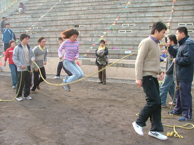 跳绳比赛中,一女生动作轻盈,空中动作优美。